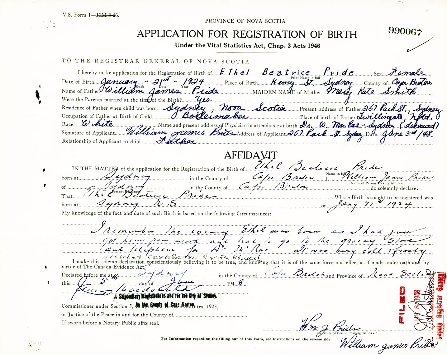 Signature of Applicant William James Pride Address of Applicant 257 Park Street, Sydney, Cape Breton Co., NS Date 3 June 1948