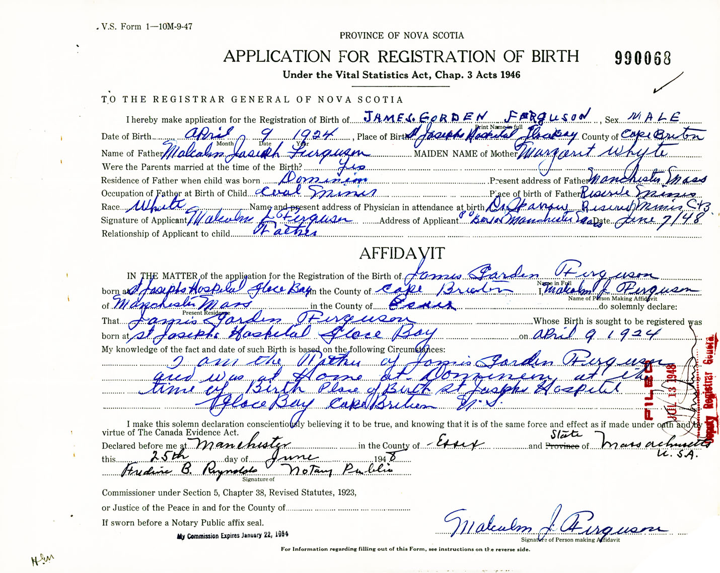 I am the father of James Gorden Ferguson and was at home at Dominion at the time of birth. Place of birth, St. Josephs Hospital, Glace Bay, Cape Breton Co., NS