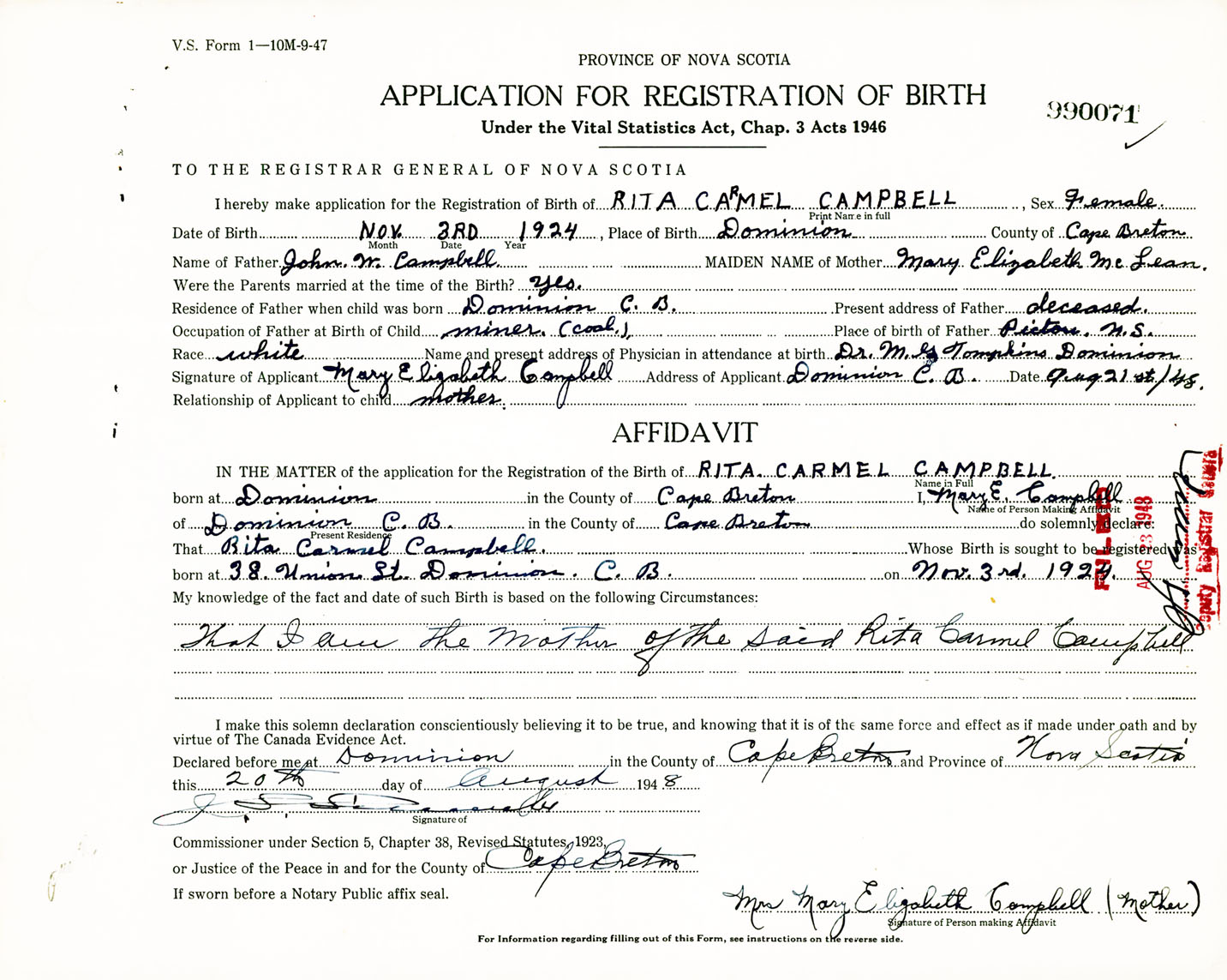 Signature of Applicant Mary Elizabeth Campbell Address of Applicant Dominion, Cape Breton Co., NS Date 21 August 1948