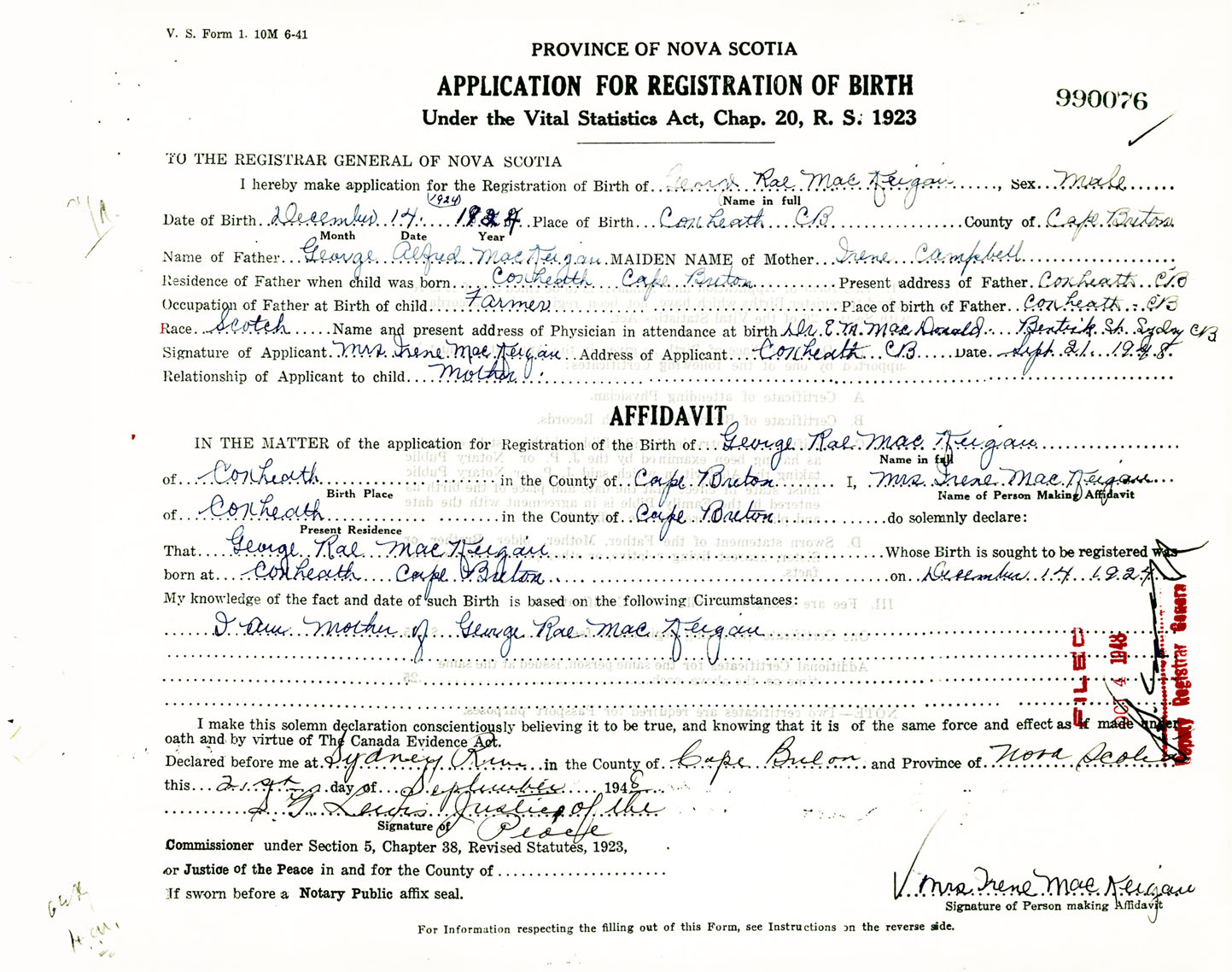 Signature of Applicant Mrs. Irene MacKeigan Address of Applicant Coxheath, Cape Breton Co., NS Date 21 September 1948
