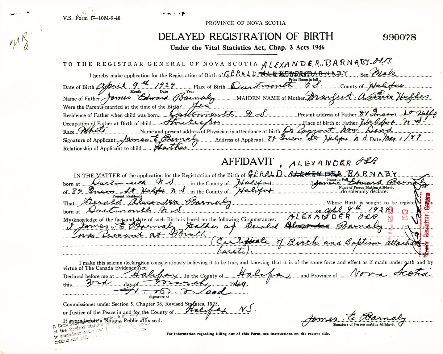 Signature of Applicant James E. Barnaby Address of Applicant 84 Queen Street, Halifax, NS Date 1 March 1949