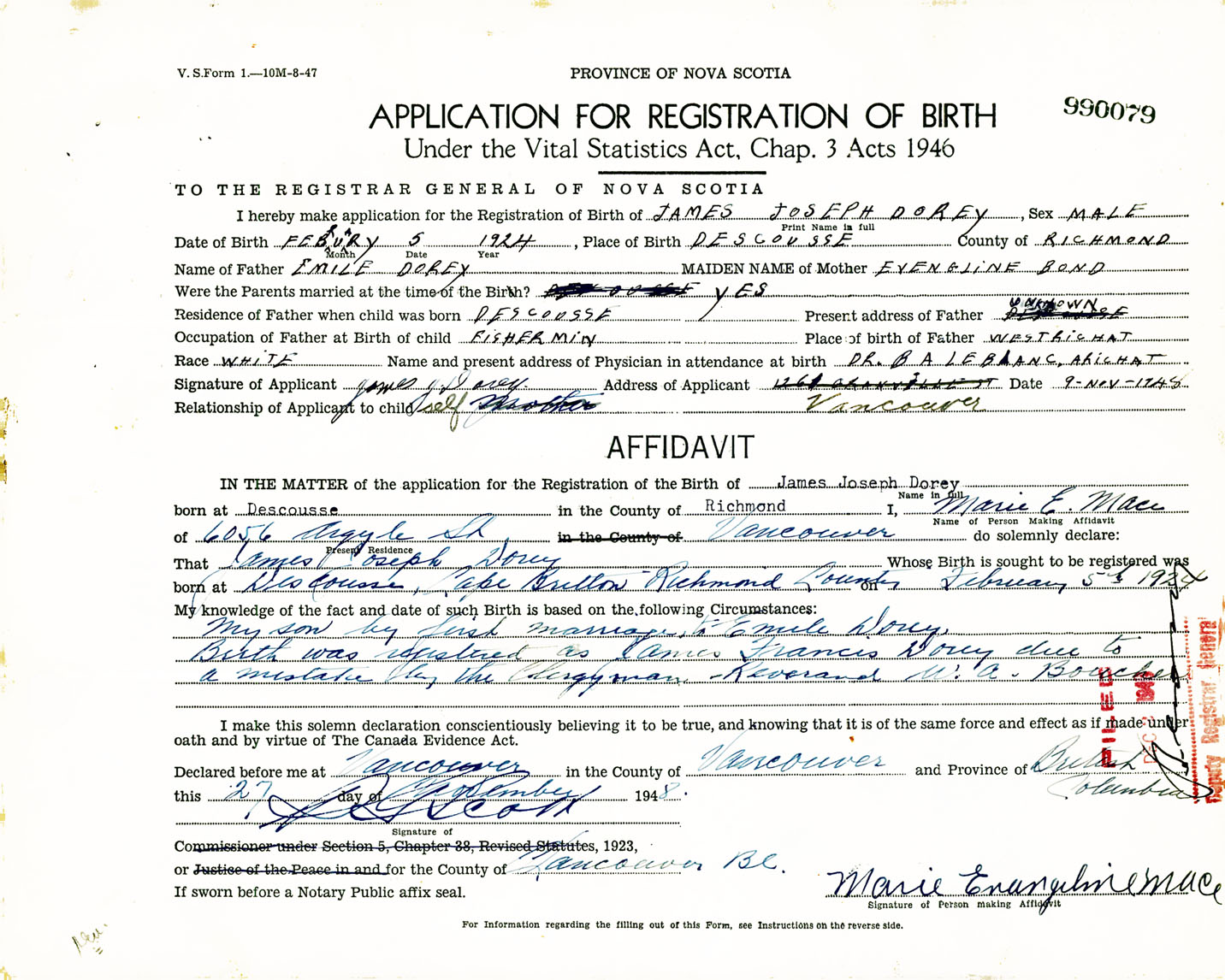 Signature of Applicant James Dorey Address of Applicant Vancouver, British Columbia Date 9 November 1948