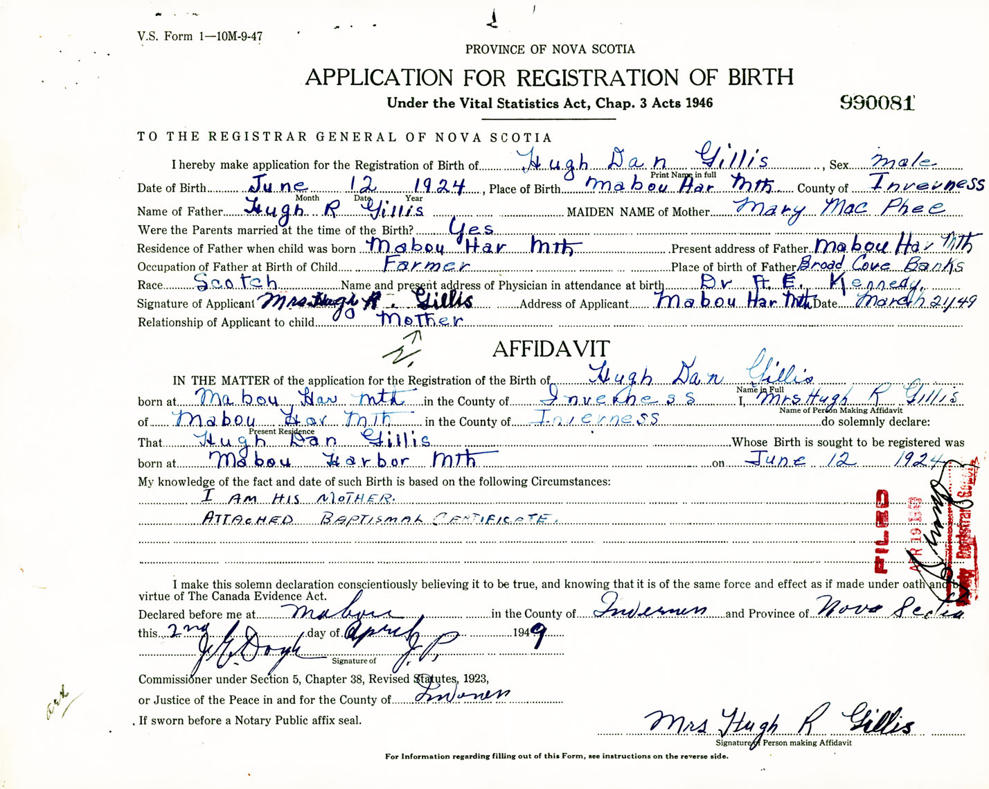 Signature of Applicant Mrs. Hugh R. Gillis Address of Applicant Mabou Harbour Mountain, Inverness Co., NS Date 21 March 1949