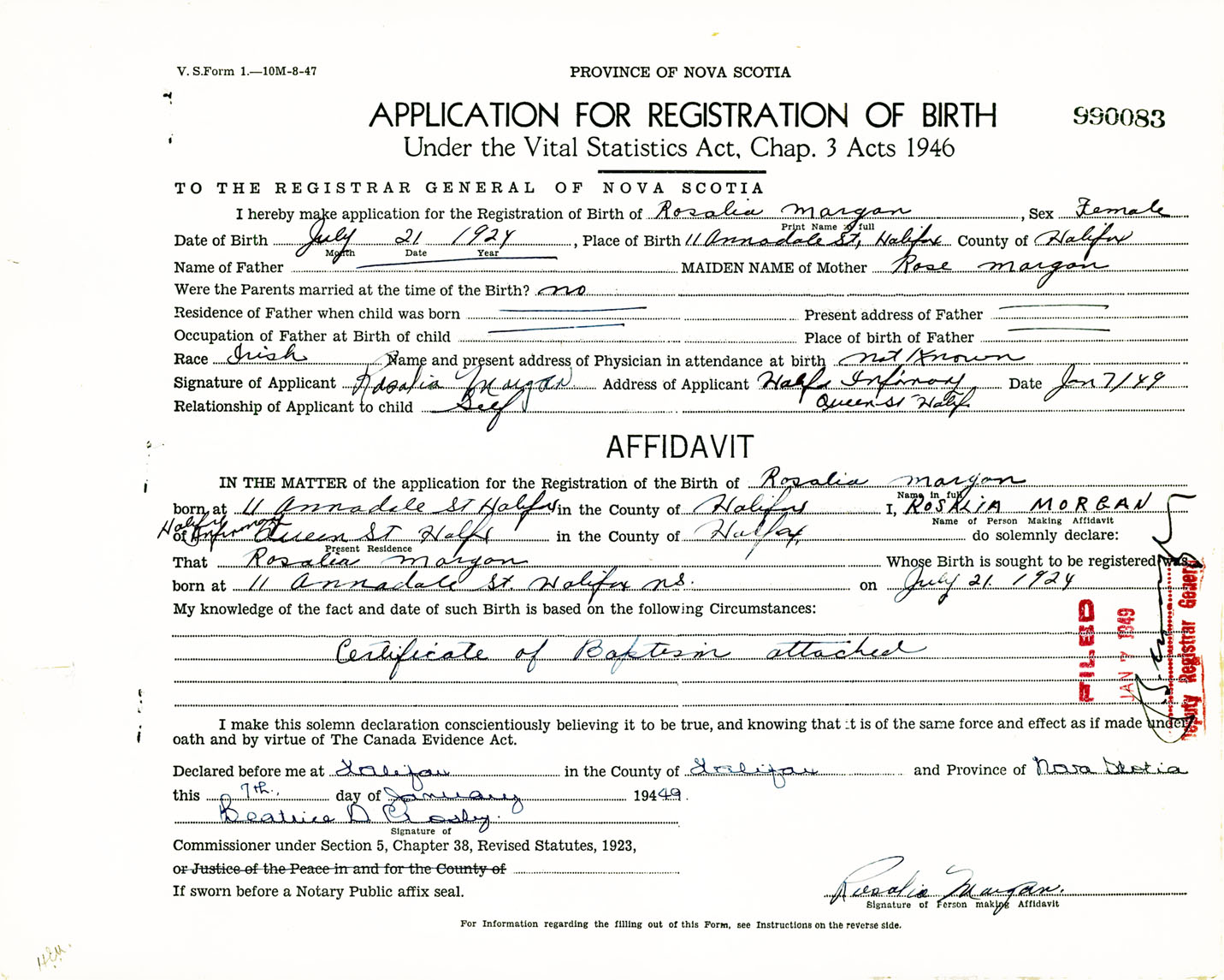 Signature of Applicant Rosalia Morgan Address of Applicant Halifax Infirmary, Queen Street, Halifax, NS Date 7 January 1949