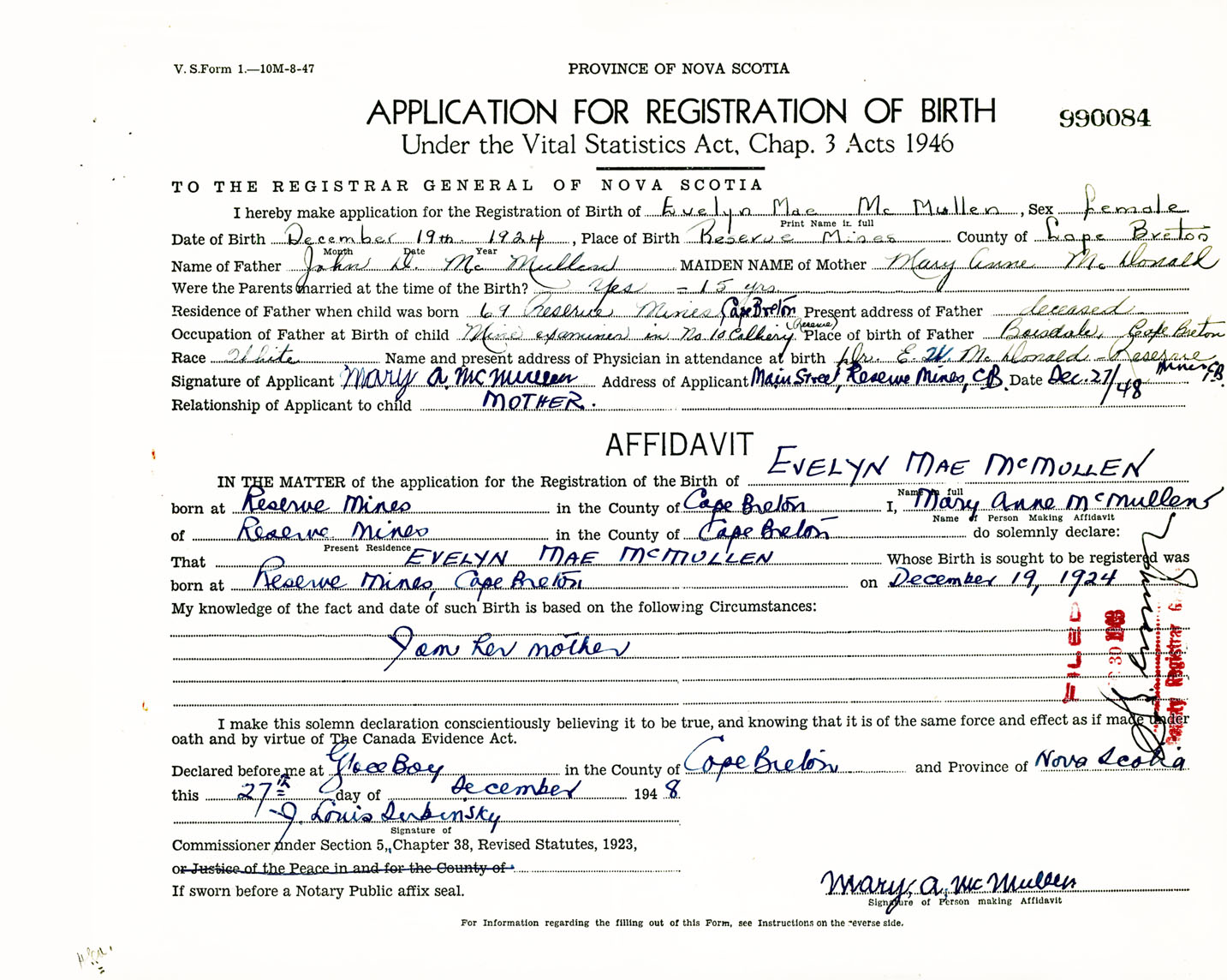 Signature of Applicant Mary A. McMullen Address of Applicant Main Street, Reserve Mines, Cape Breton Co., NS Date 27 December 1948
