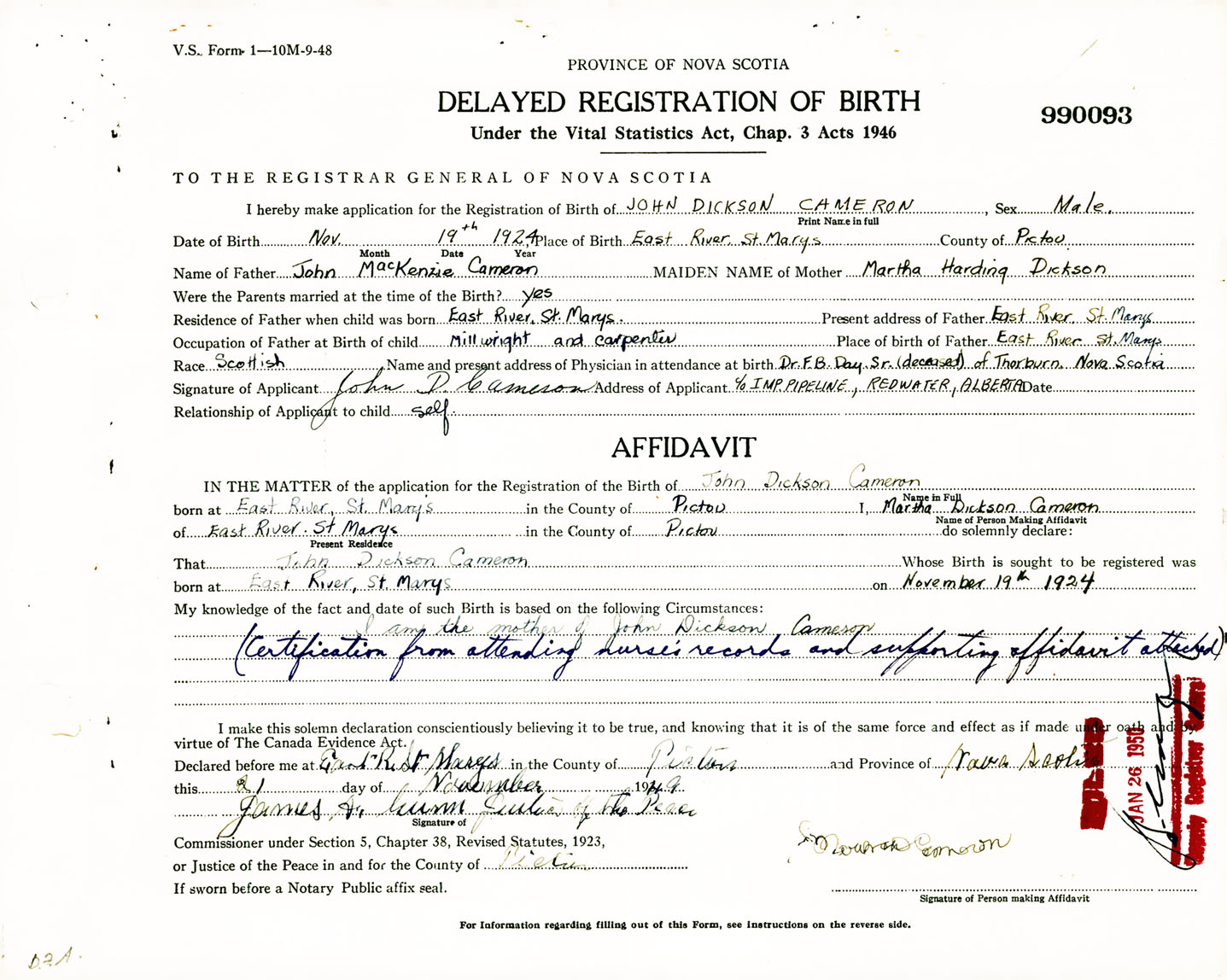 Signature of Applicant John D. Cameron Address of Applicant c/o IMP Pipeline, Redwater, Alberta Date 21 November 1949
