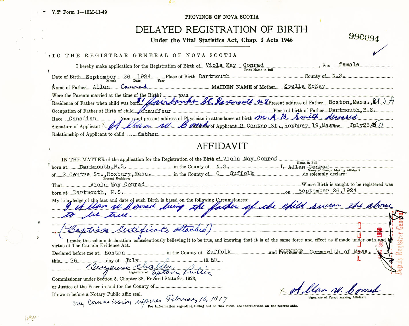 Signature of Applicant Allan W. Conrad Address of Applicant 2 Centre Street, Roxbury, Massachusetts Date 26 July 1950