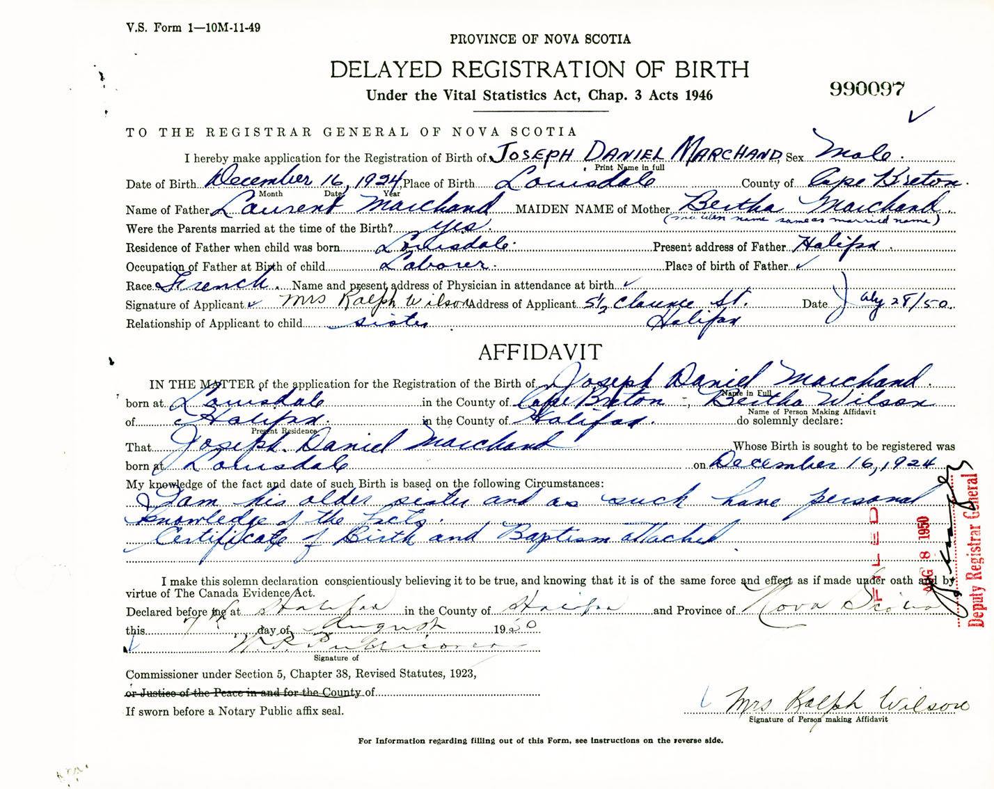 Signature of Applicant Mrs. Ralph Wilson Address of Applicant 5 1/2 Clarence Street, Halifax, NS Date 28 July 1950