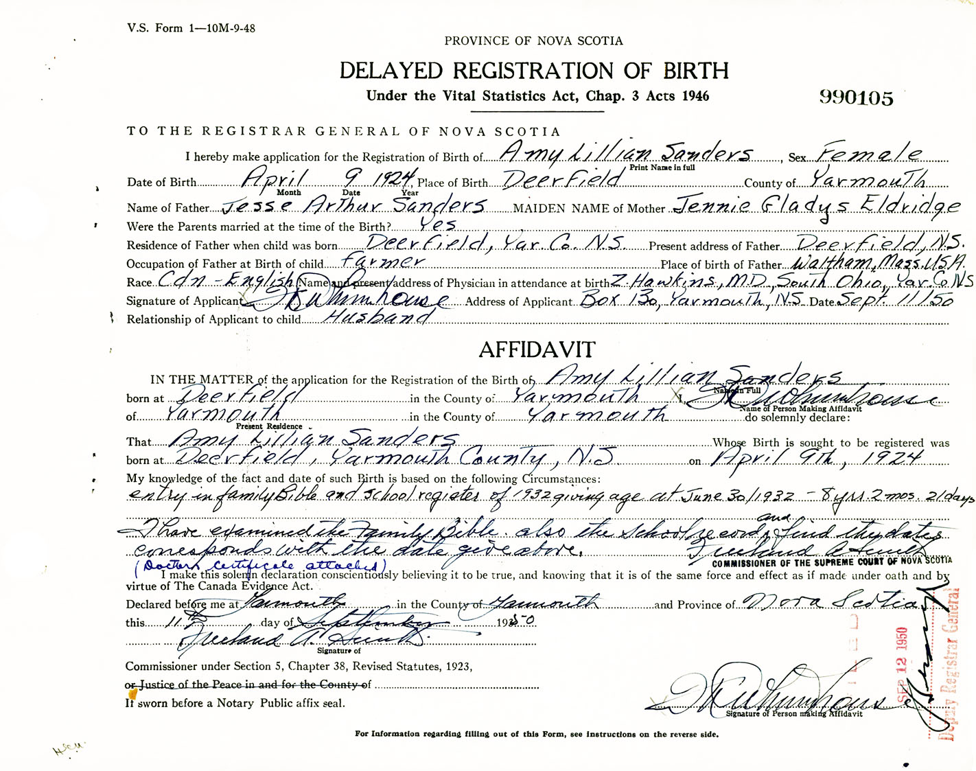 Date of Birth April 9, 1924 Place of Birth DeerfieldCounty of Yarmouth