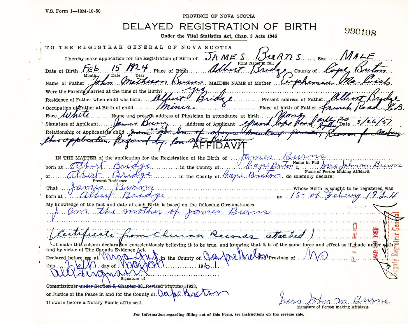 Signature of Applicant James Burns Address of Applicant Grand Cape Road, Sydney, Cape Breton Co., NS Date 26 March 1951