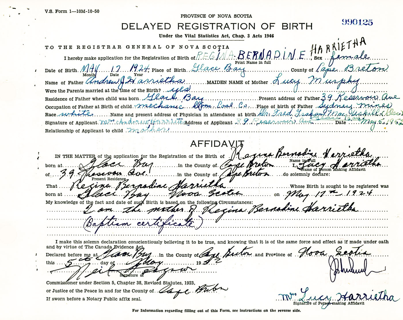 Signature of Applicant Mrs. Andrew Harrietha Address of Applicant 39 Reservoir Avenue, Glace Bay, Cape Breton Co., NS Date 5 May 1952