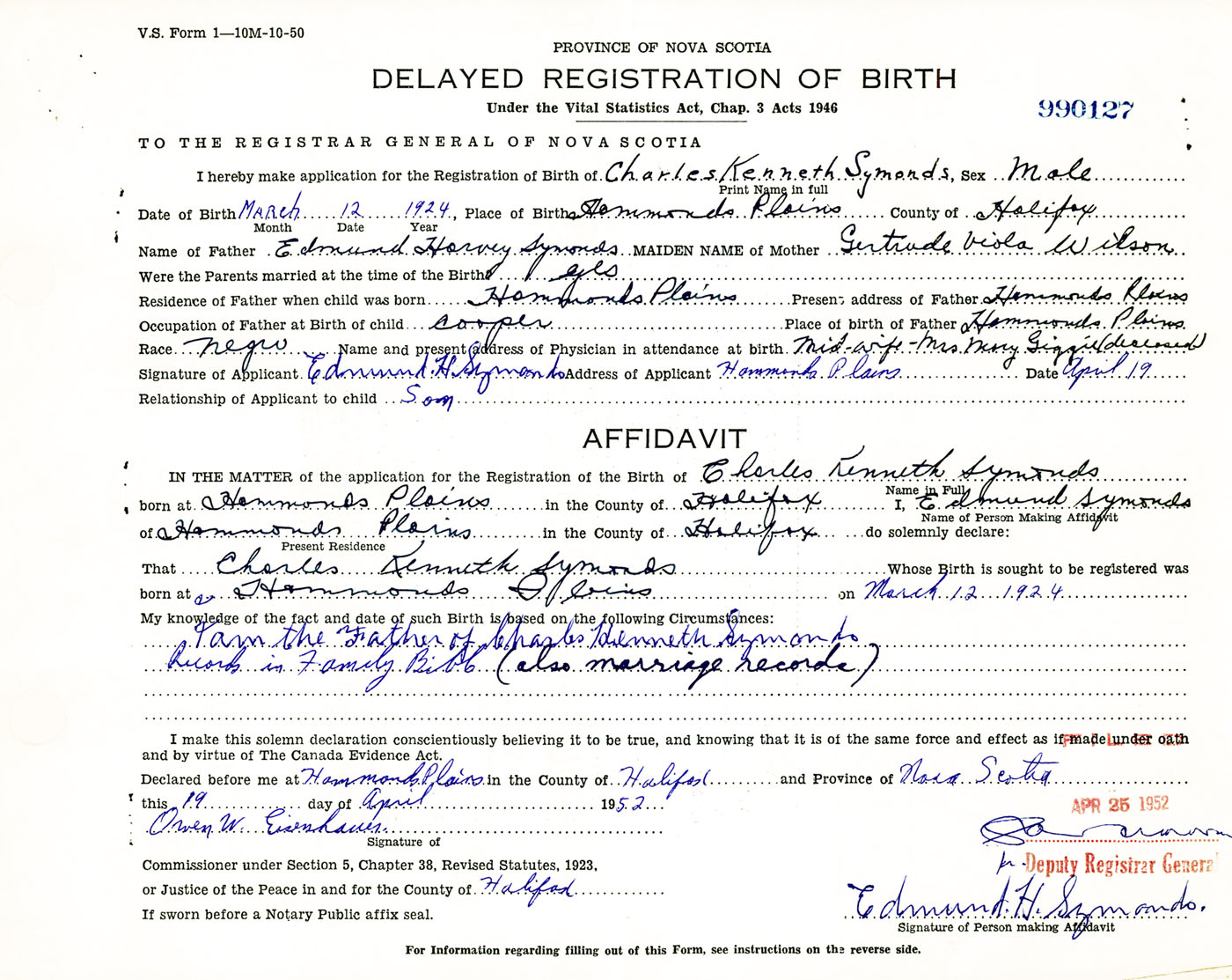 Signature of Applicant Edmund H. Symonds Address of Applicant Hammonds Plains, Halifax Co., NS Date 19 April 1952