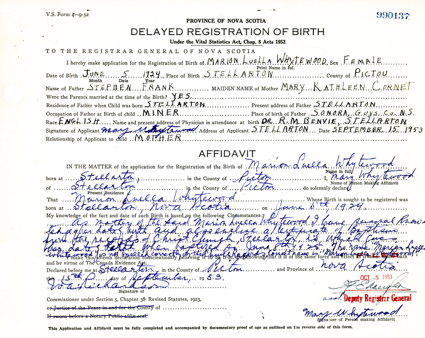 As mother of the said Marion Luella Whytewood, I have personal knowledge of her date of birth and also enclose a certificate of baptism from the records of Christ Church, Stellarton, NS which hives the date of birth when baptized on June 8, 1925. The name Marion Luella Whitewood is not spelled correctly on the Church Records. Correct name is Marion Luella Whytewood