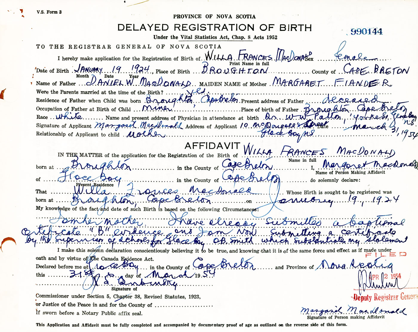 Signature of Applicant Margaret MacDonald Address of Applicant 10 McDougall Street, Glace Bay, Cape Breton Co., NS Date 31 March 1954