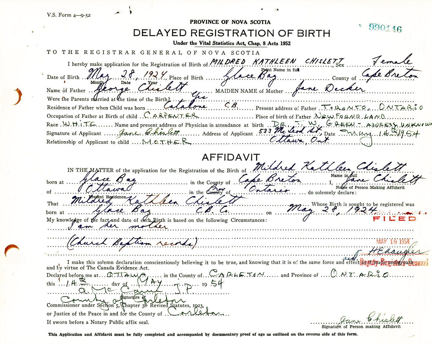 Signature of Applicant Jane Chislett Address of Applicant 533 McLeod Street, Ottawa, Ontario Date 14 May 1954