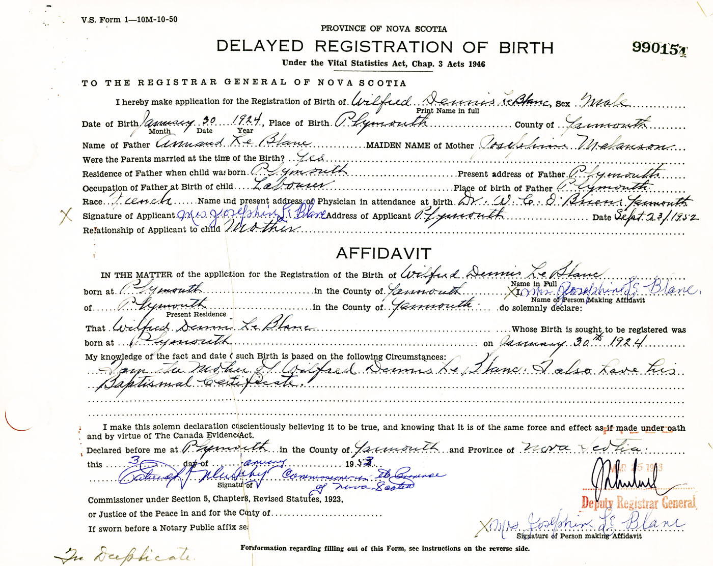 I hereby make application for the Registration of Birth of Wilfred DennisLeBlanc Sex Male
