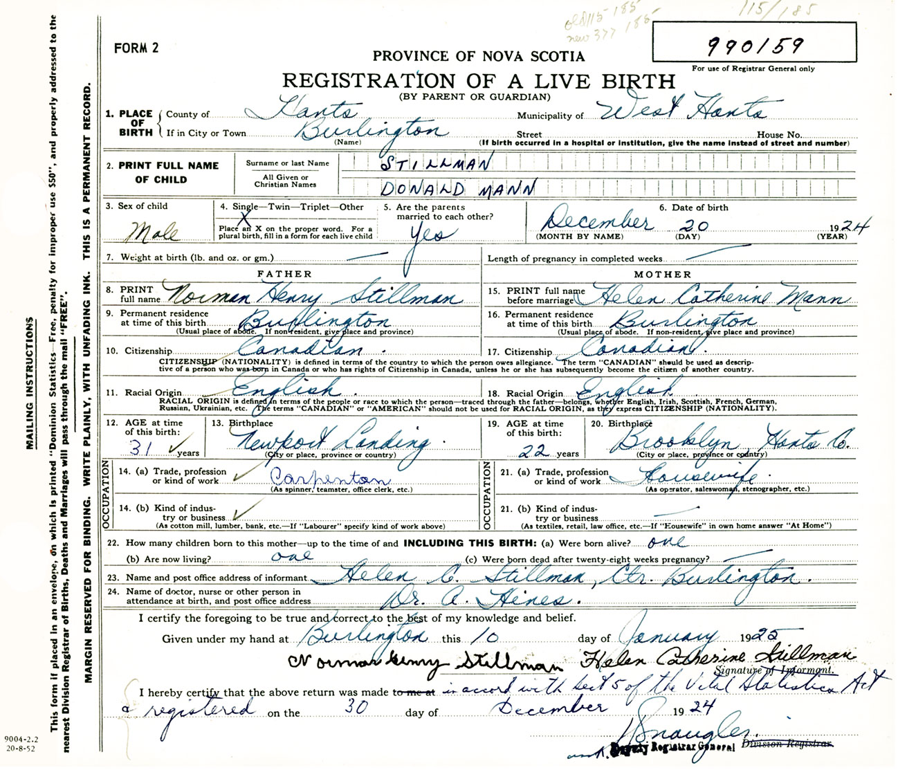I hereby make application for the Registration of Birth of Donald MannStillman Sex Male