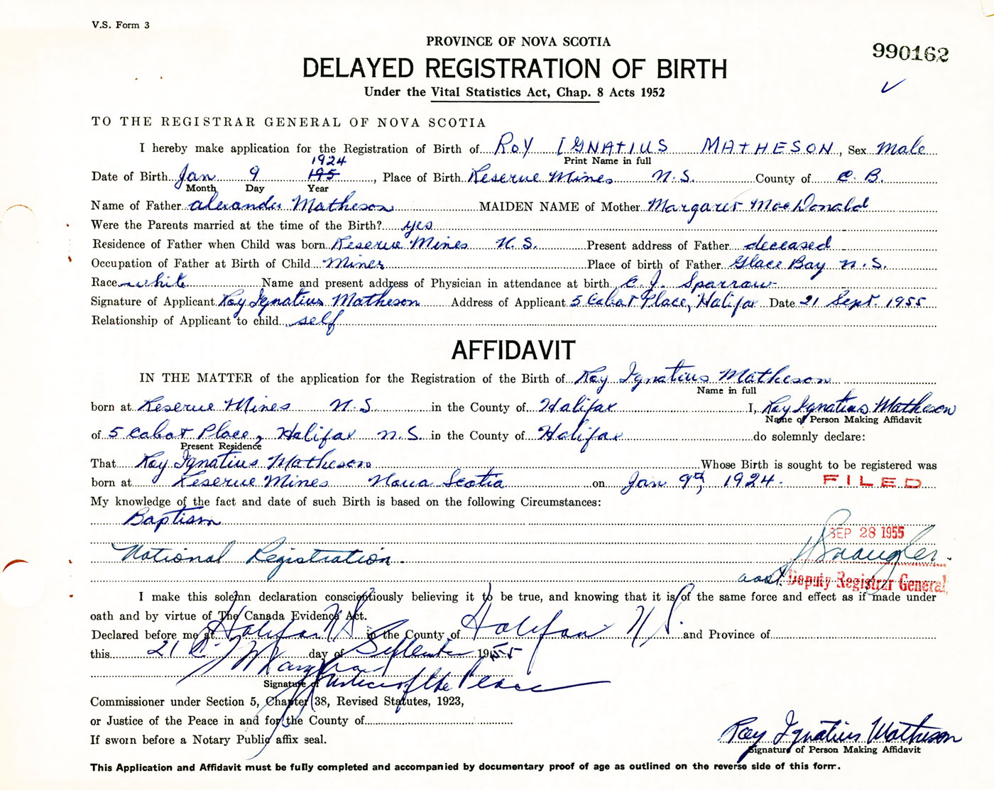 Signature of Applicant Roy Ignatius Matheson Address of Applicant 5 Cabot Place, Halifax, NS Date 21 September 1955