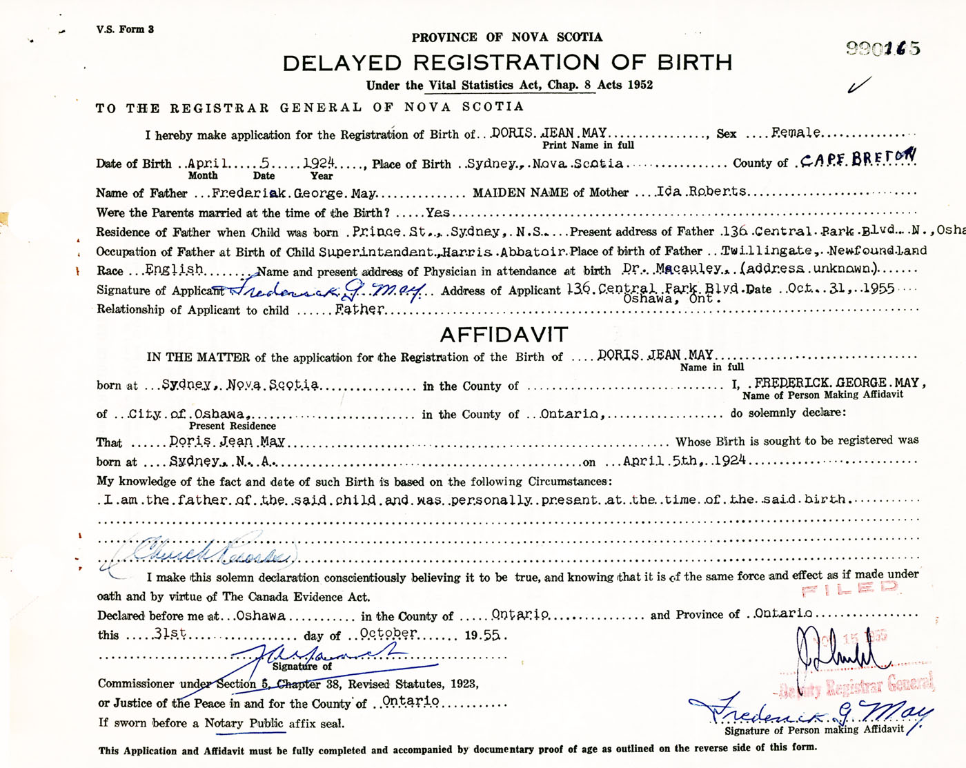 Signature of Applicant Frederick G. May Address of Applicant 136 Central Park Blvd N, Oshawa, Ontario Date 31 October 1955