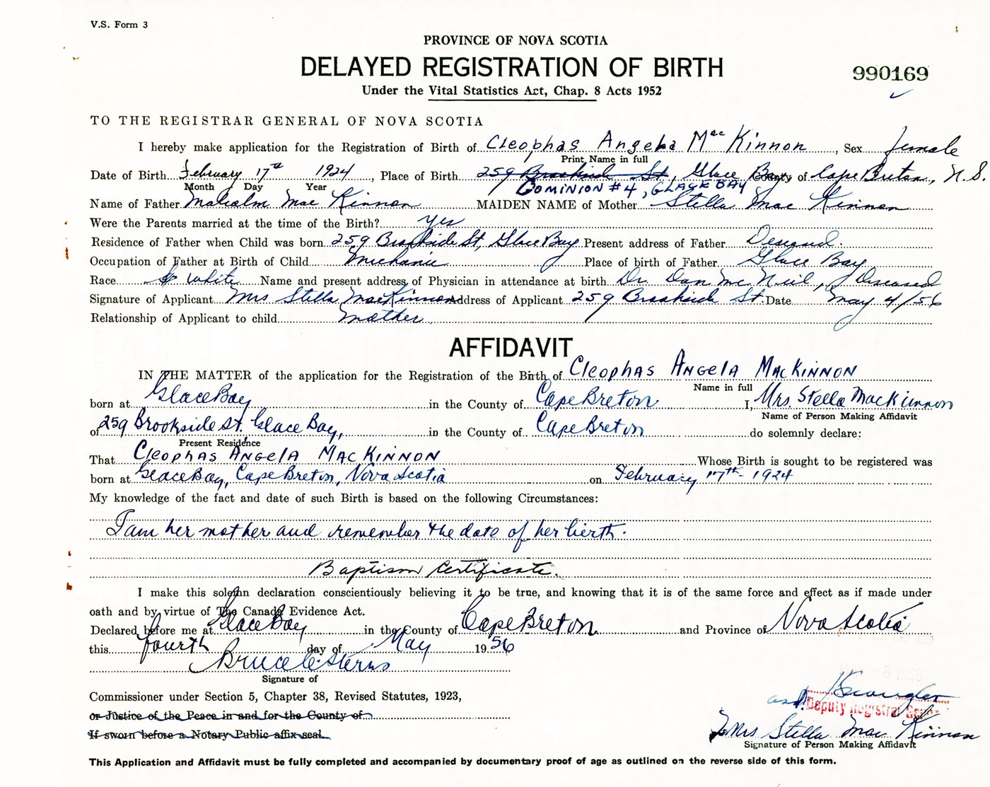 I hereby make application for the Registration of Birth of Cleophas AngelaMacKinnon Sex Female