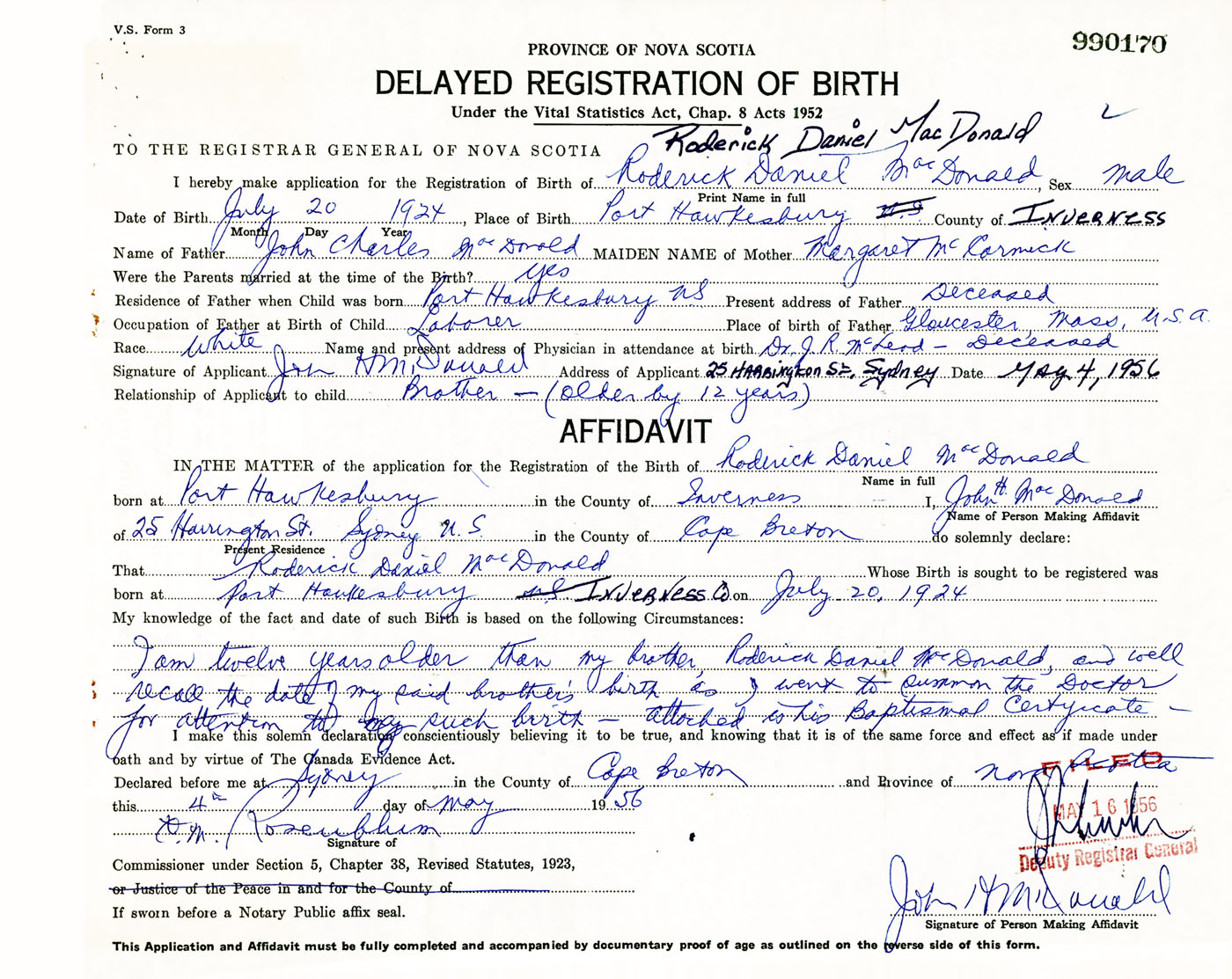Signature of Applicant John H. MacDonald Address of Applicant 25 Harrington Street, Sydney, Cape Breton Co., NS Date 4 May 1956