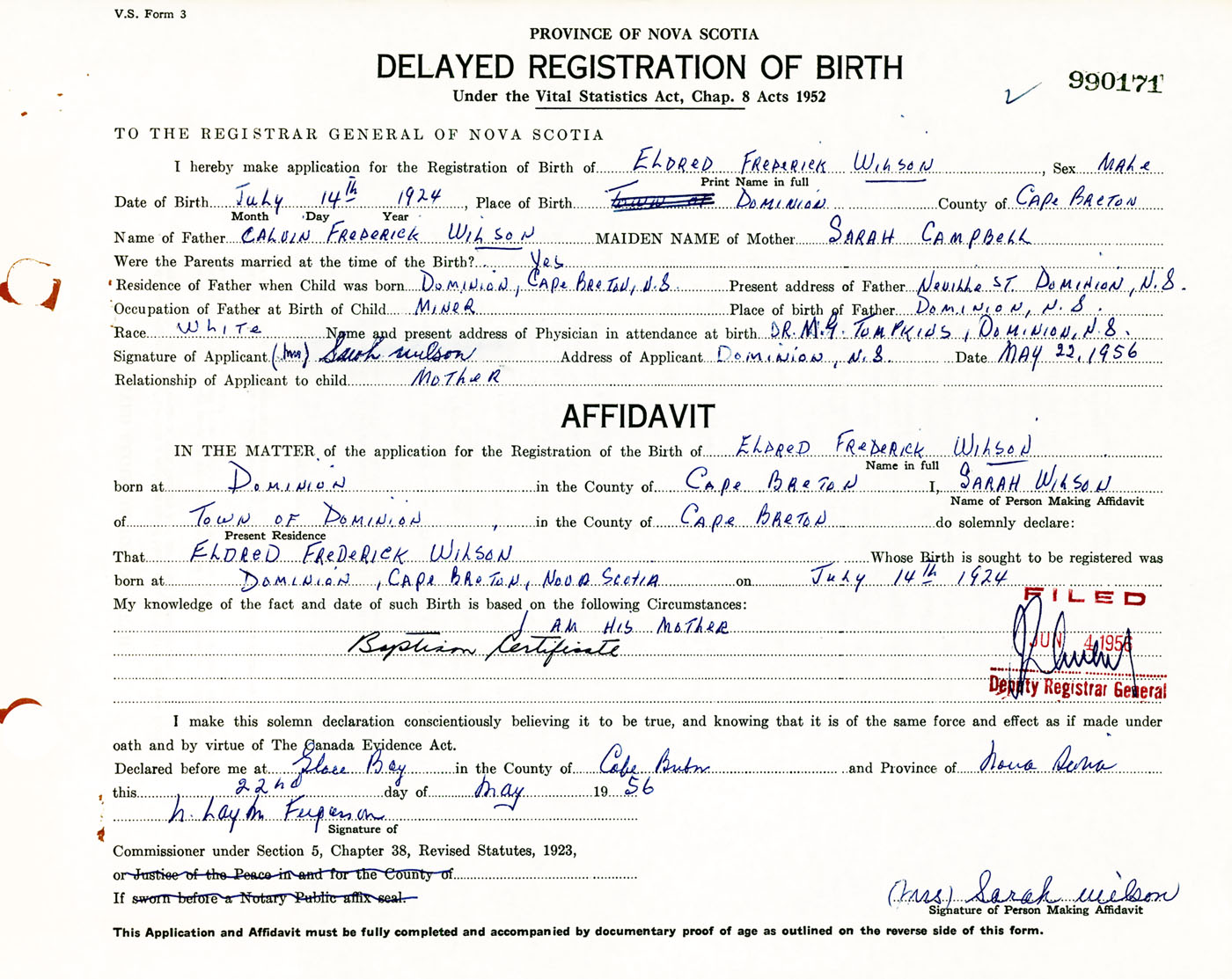 Signature of Applicant Sarah Wilson Address of Applicant Dominion, Cape Breton Co., NS Date 22 May 1956