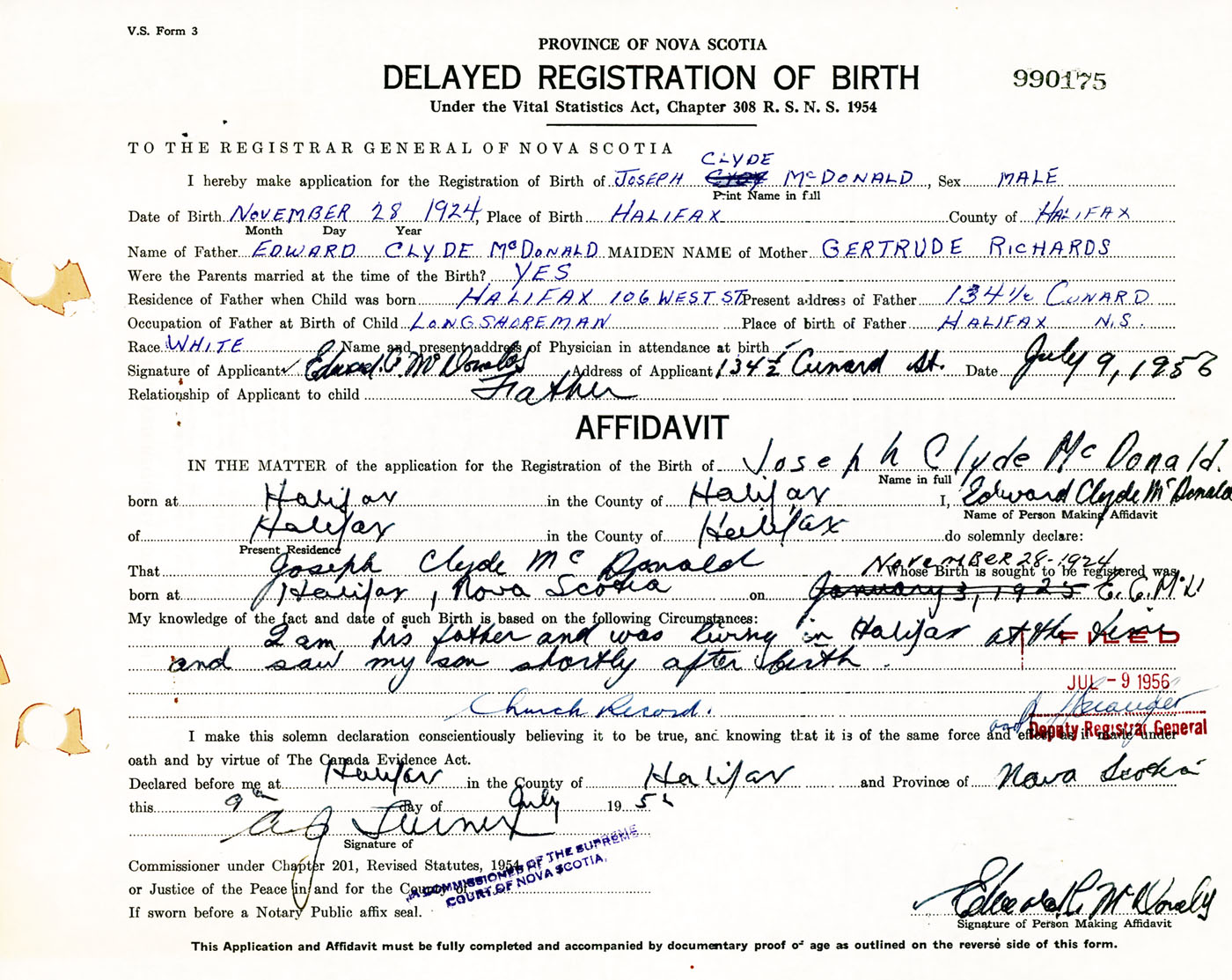 I hereby make application for the Registration of Birth of Joseph ClydeMcDonald Sex Male