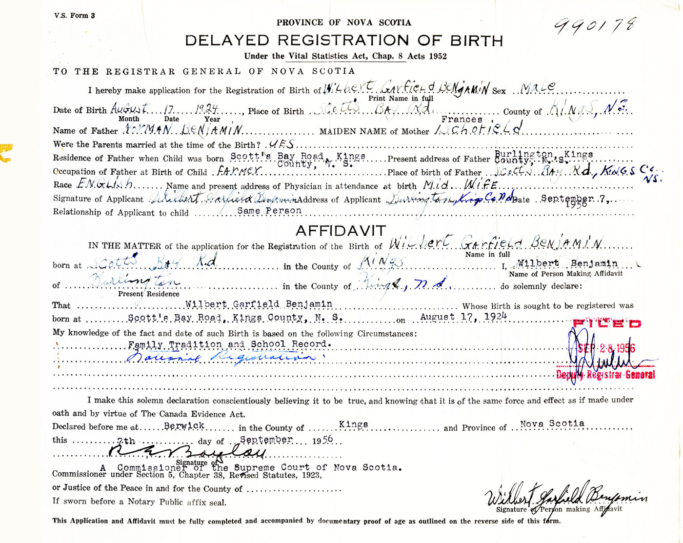 Signature of Applicant Wilbert Garfield Benjamin Address of Applicant Burlington, Kings Co., NS Date 7 September 1956