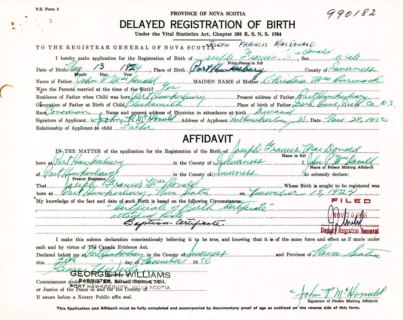 Signature of Applicant John P. McDonald Address of Applicant Port Hawkesbury, Inverness Co., NS Date 29 November 1956