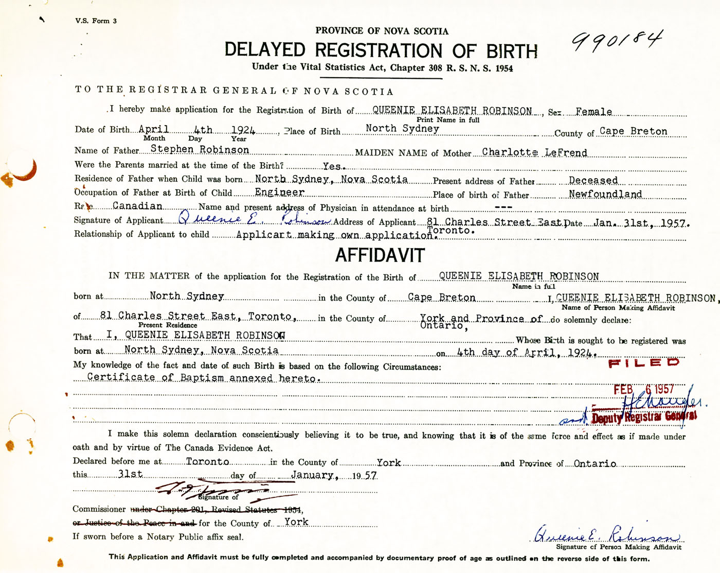Signature of Applicant Queenie E. Robinson Address of Applicant 81 Charles Street East, Toronto, Ontario Date 31 January 1957