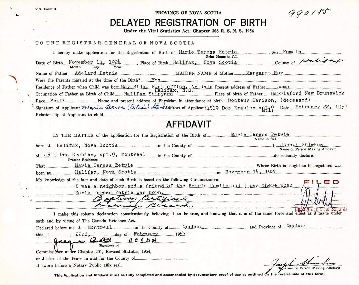 Signature of Applicant Marie Teresa Shimkus Address of Applicant 4519 Des Erables, Apt. 9, Montreal, Quebec Date 22 February 1957