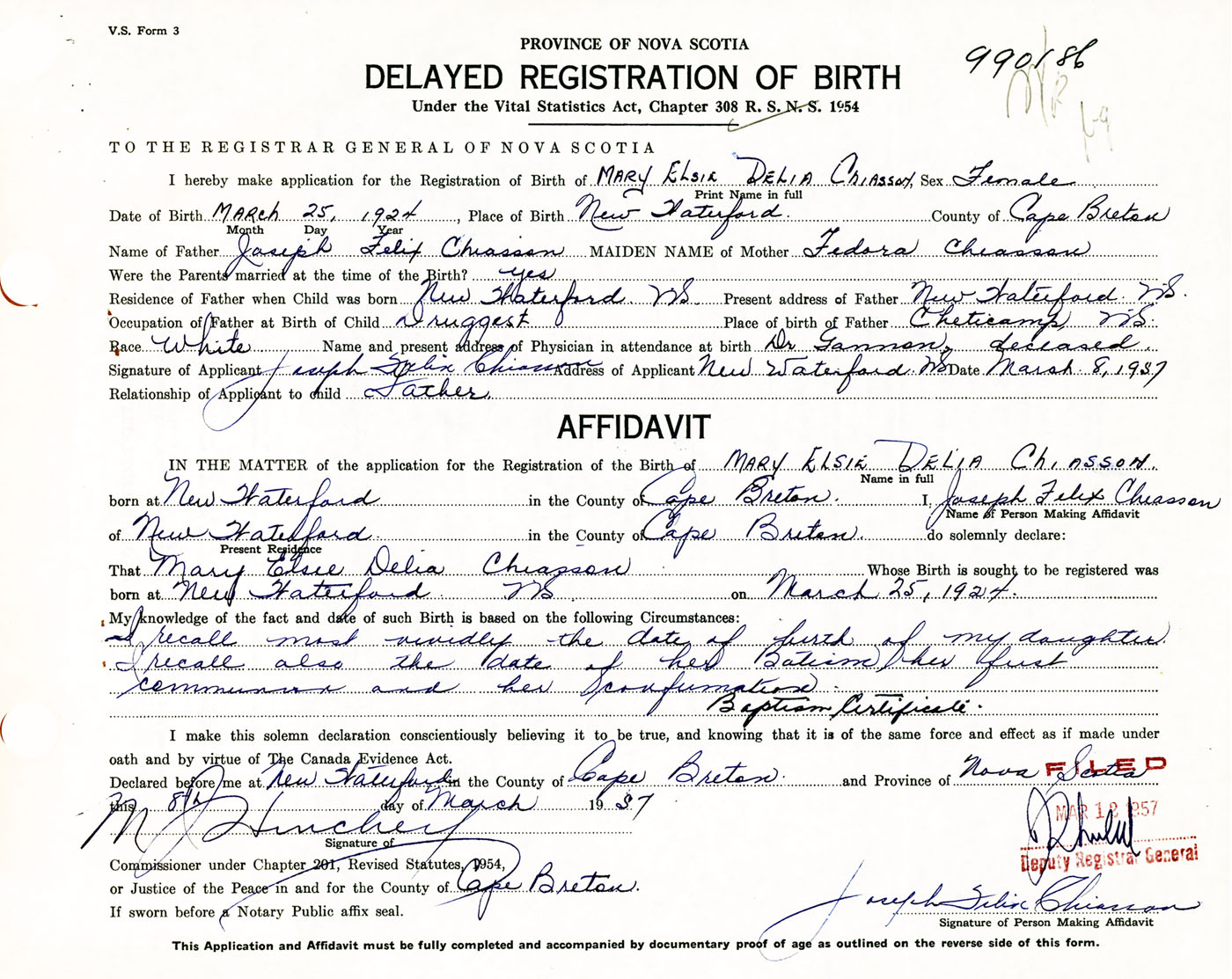 IN THE MATTER of the application for the Registration of the Birth of Mary Elsie DeliaChiasson