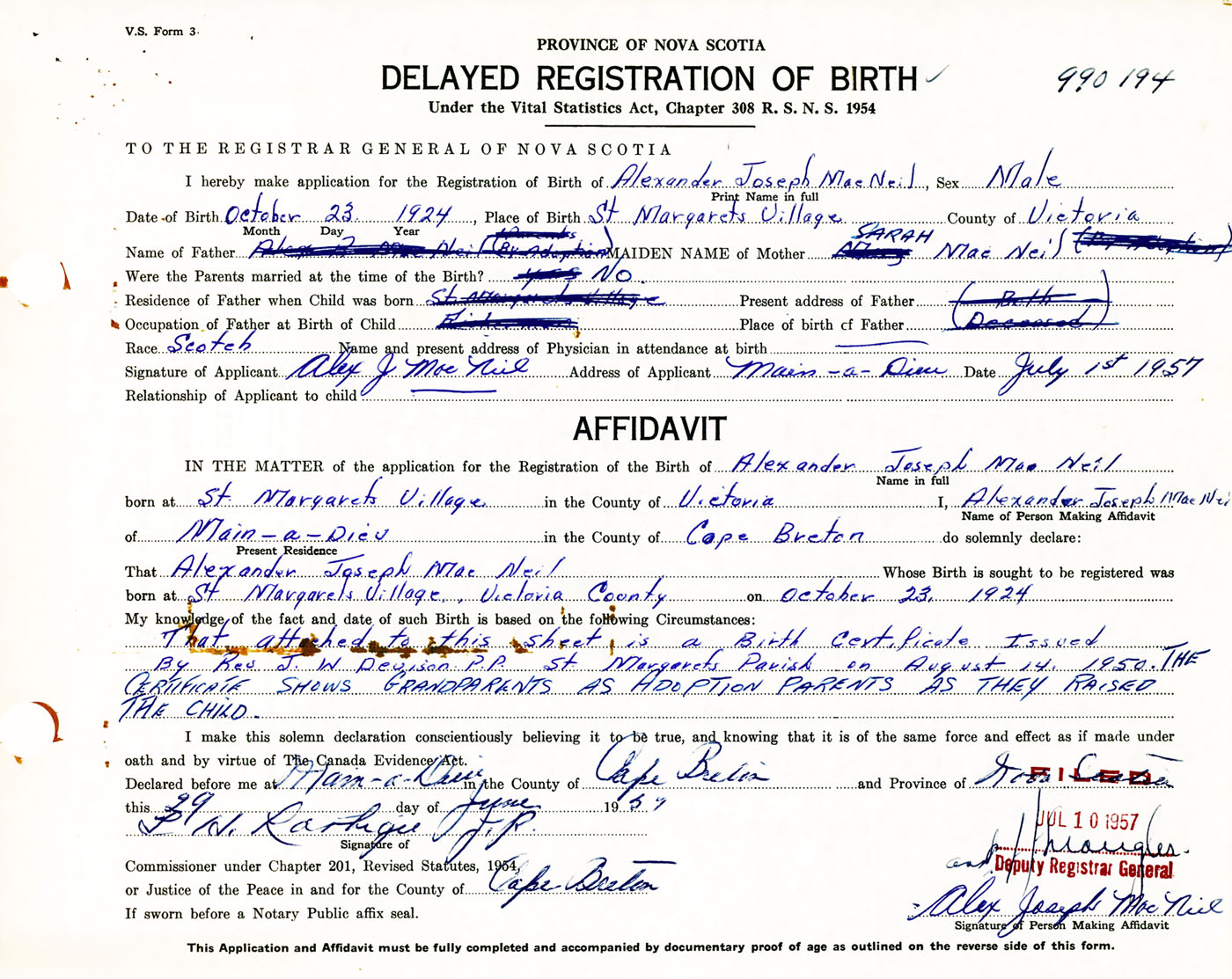 Signature of Applicant Alex J. MacNeil Address of Applicant Main-a-Dieu, Cape Breton Co., NS Date 1 July 1957