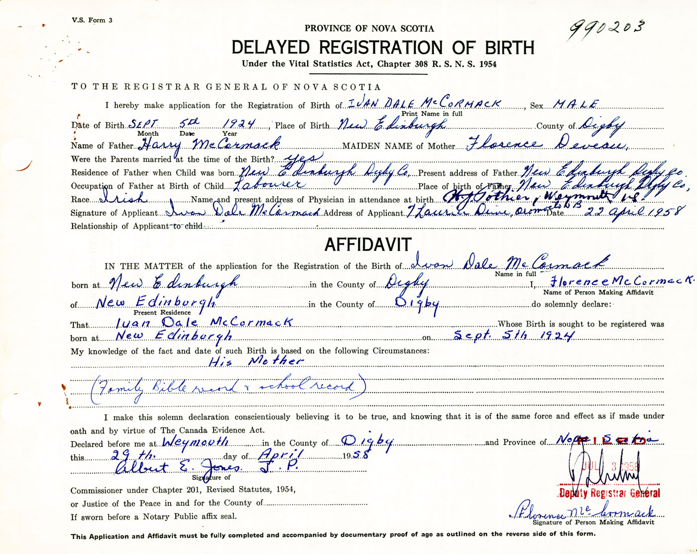 Signature of Applicant Ivan Dale McCormack Address of Applicant 7 Laurier Drive, Oromocto, New Brunswick Date 22 April 1958