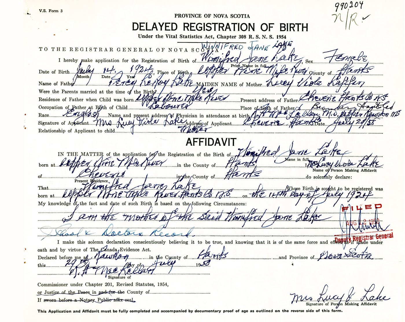 I hereby make application for the Registration of Birth of Winnifred JaneLake Sex Female