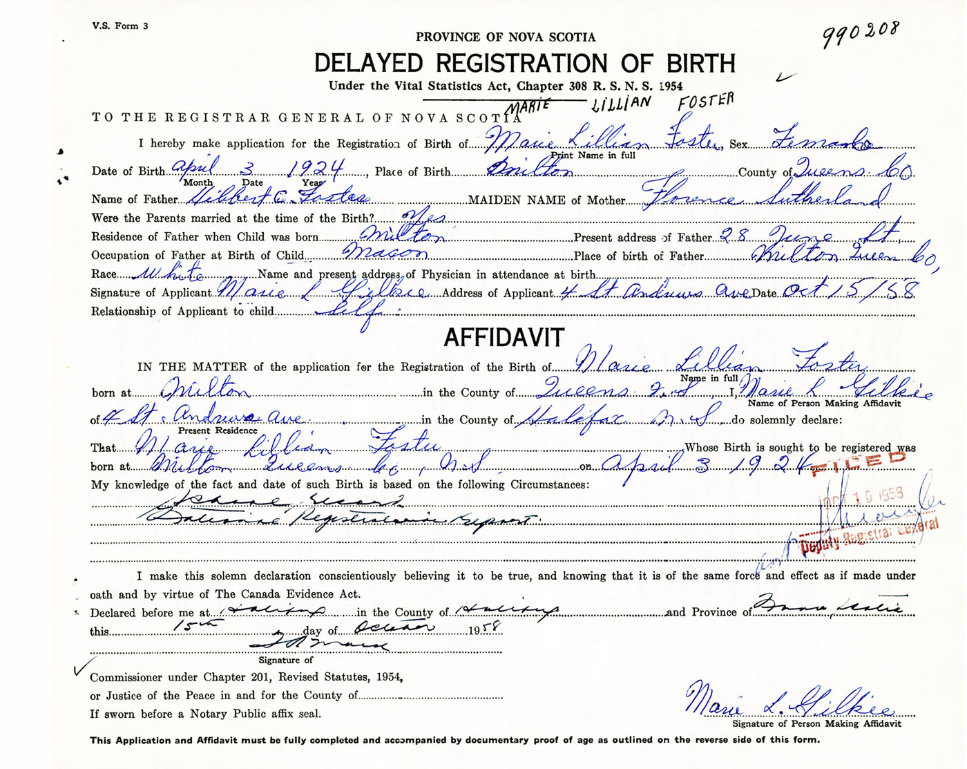 Signature of Applicant Marie L. Gilkie Address of Applicant 4 St. Andrews Avenue, Halifax, NS Date 15 October 1958