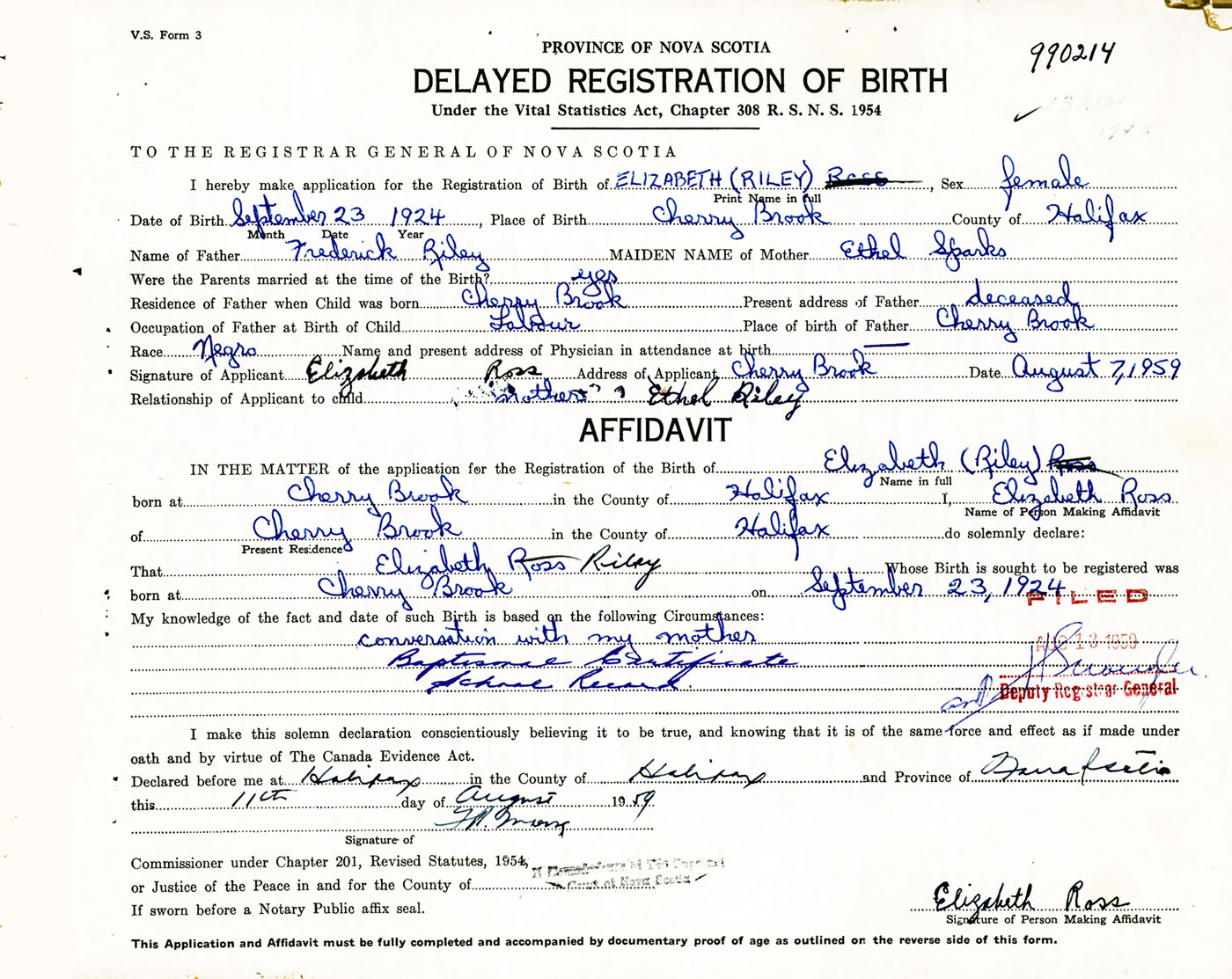 Signature of Applicant Elizabeth Ross Address of Applicant Cherrybrook, Halifax Co., NS Date 7 August 1959
