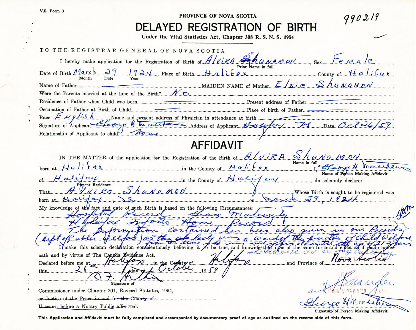 I hereby make application for the Registration of Birth of AlviraShunamon Sex Female