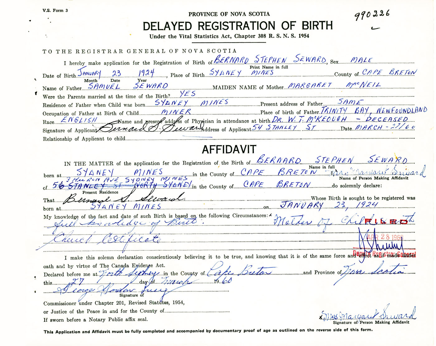 Signature of Applicant Bernard S. Seward Address of Applicant 54 Stanley Street, North Sydney, Cape Breton Co., NS Date 27 March 1960
