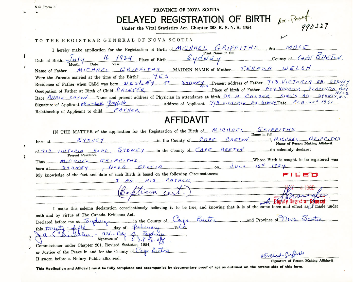 Signature of Applicant Michael Griffiths Address of Applicant 713 Victoria Road, Sydney, Cape Breton Co., NS Date 25 February 1960