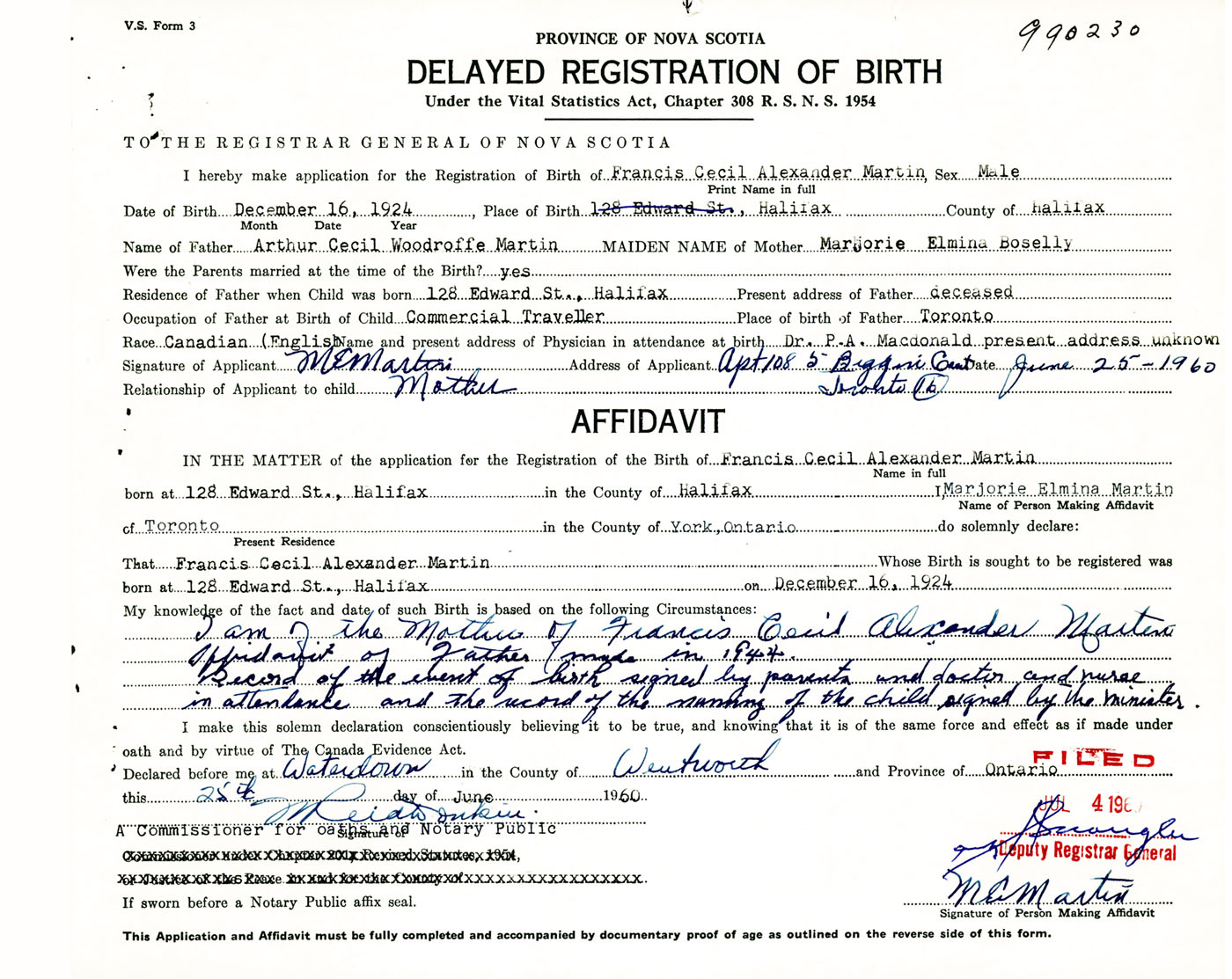 I am of the mother of Francis Cecil Alexander Martin Affidavit of Father, made in 1944 Record of the event of birth signed by parents and doctor and nurse in attendance and the record of the naming of the child signed by the minister