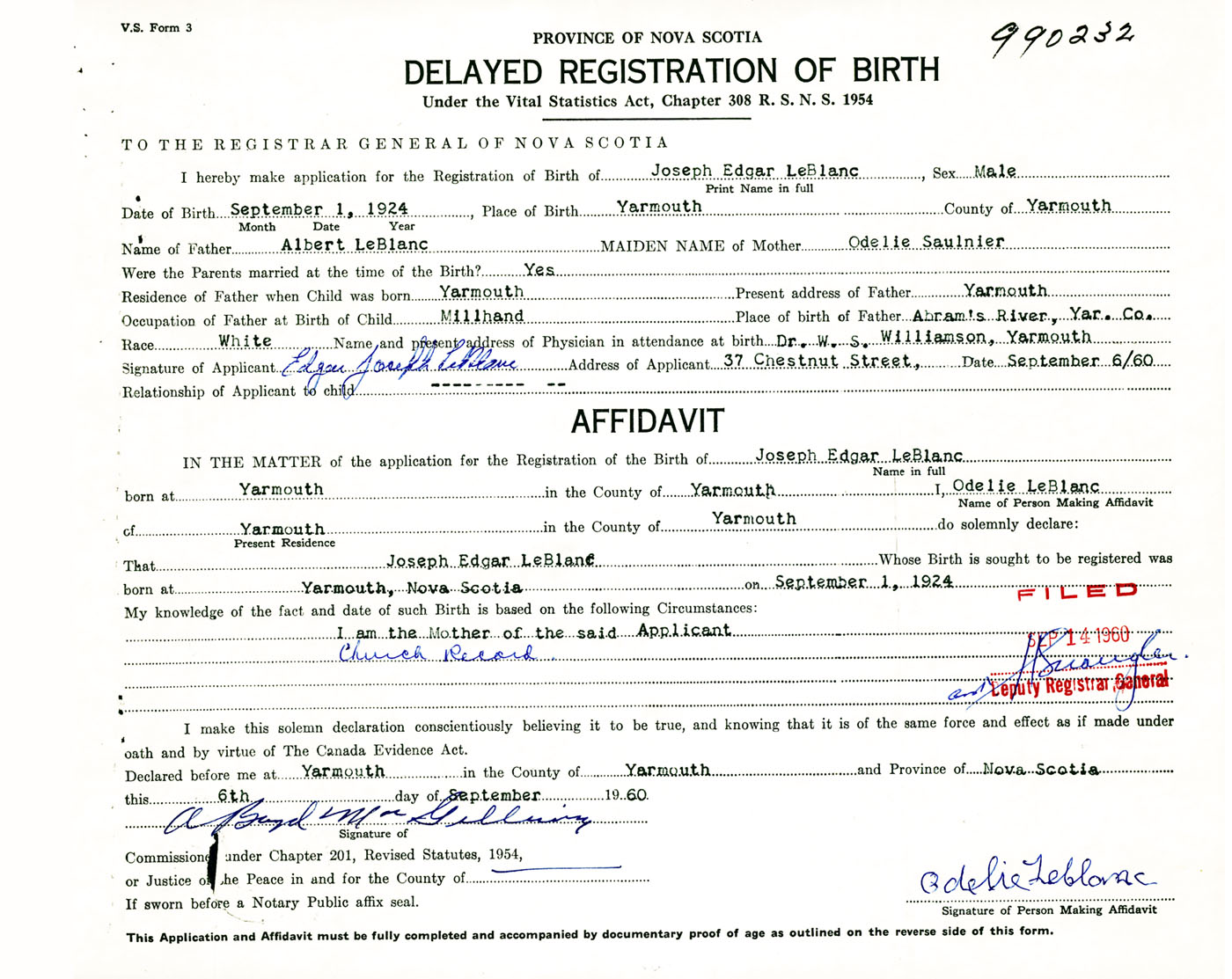 I hereby make application for the Registration of Birth of Joseph EdgarLeBlanc Sex Male