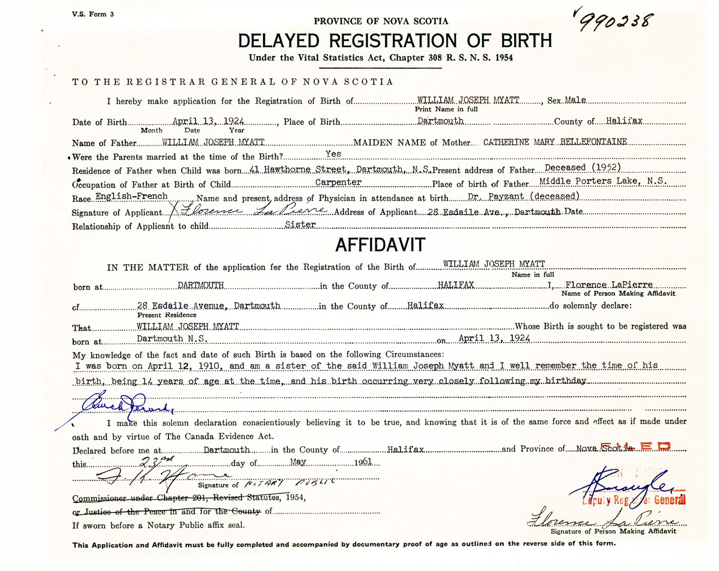 Signature of Applicant Florence LaPierre Address of Applicant 28 Esdaile Avenue, Dartmouth, NS Date 23 May 1961