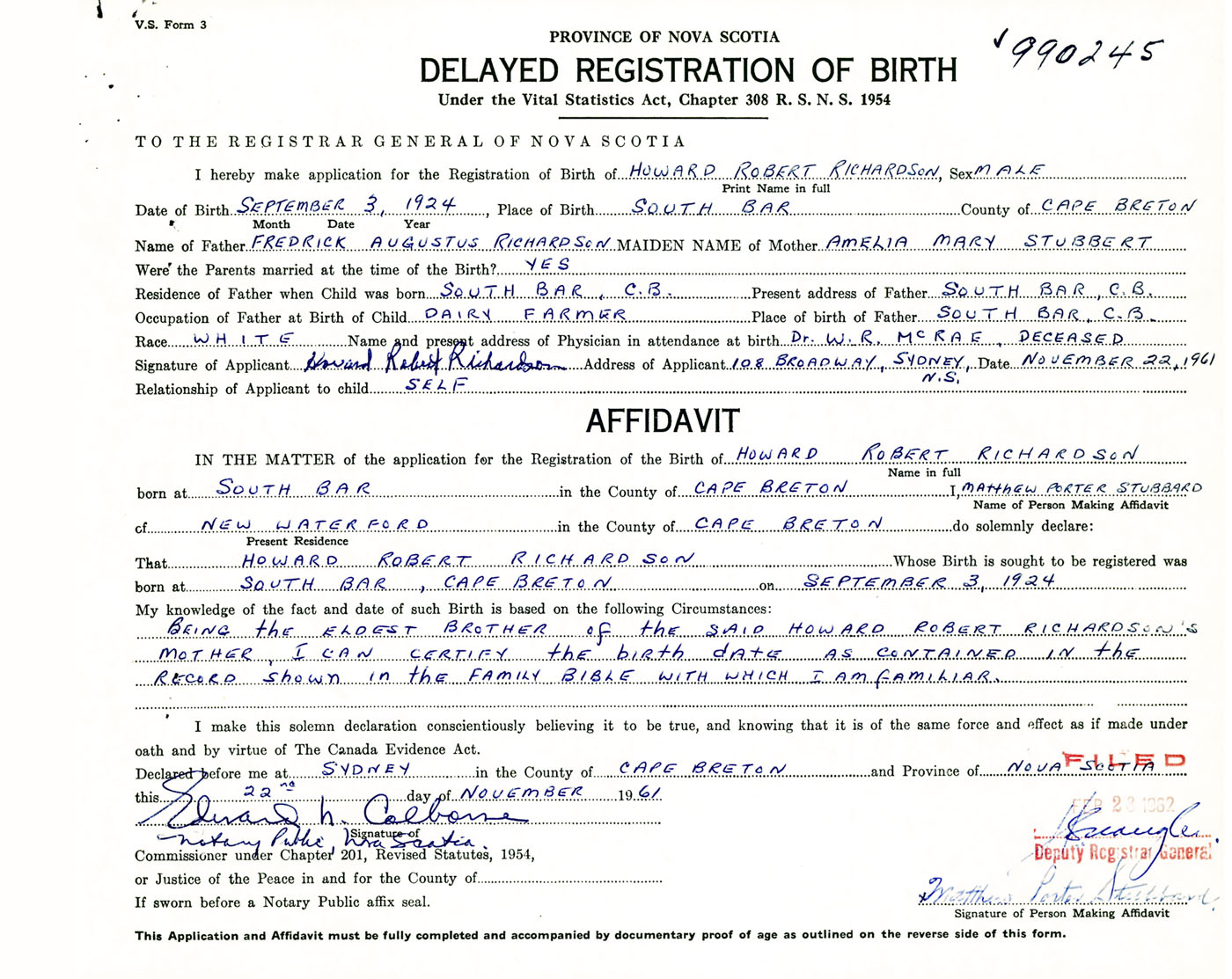 Signature of Applicant Howard Robert Richardson Address of Applicant 108 Broadway, Sydney, Cape Breton Co., NS Date 22 November 1961