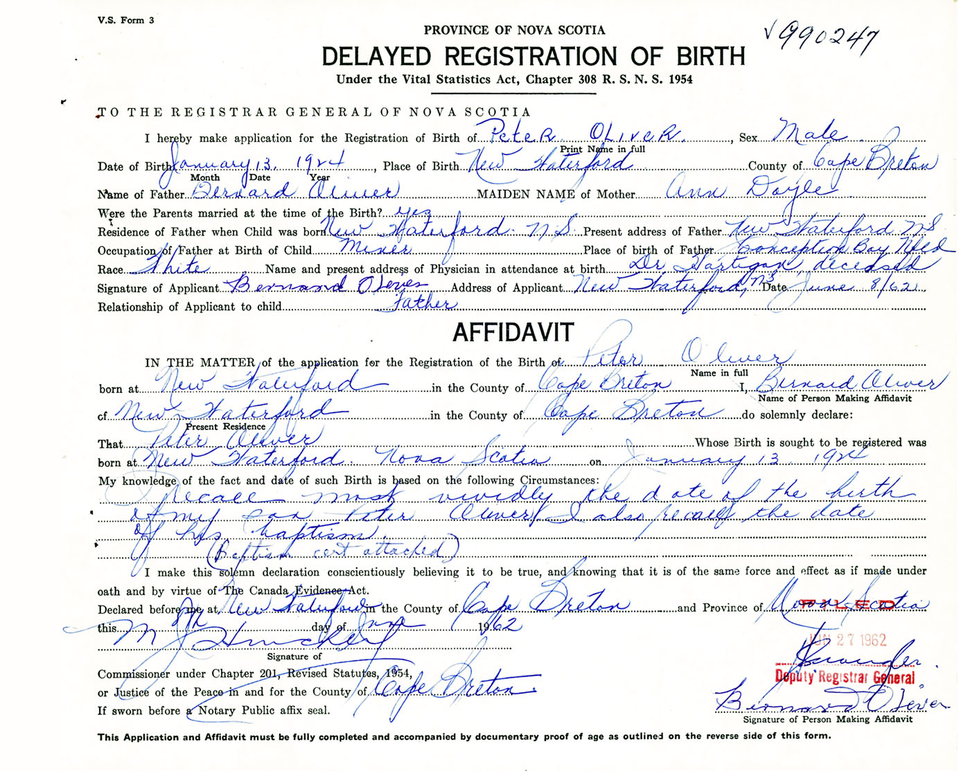 I recall most vividly the date of the birth of my son Peter Oliver. I also recall the date of his baptism (Baptism certificate attached)