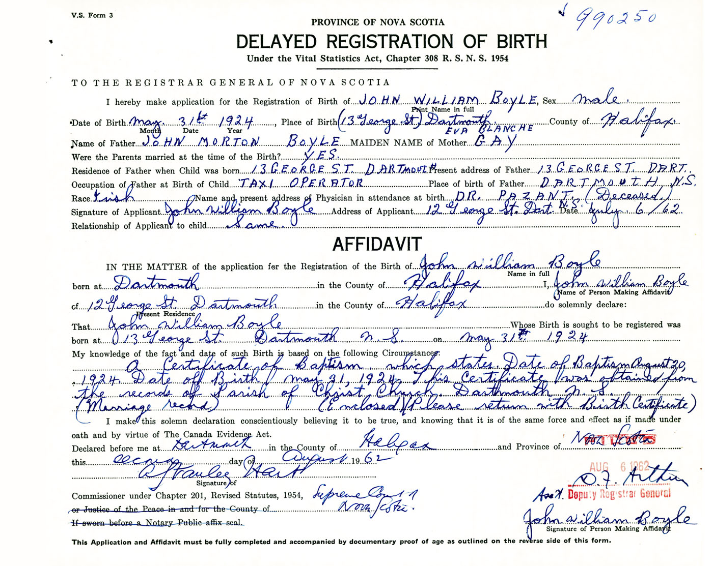 Signature of Applicant John William Boyle Address of Applicant 12 George Street, Dartmouth, NS Date 6 July 1962