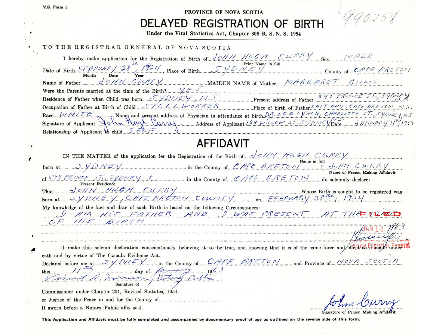 Signature of Applicant John Hugh Curry Address of Applicant 124 Willow Street, Sydney, Cape Breton Co., NS Date 11 January 1963