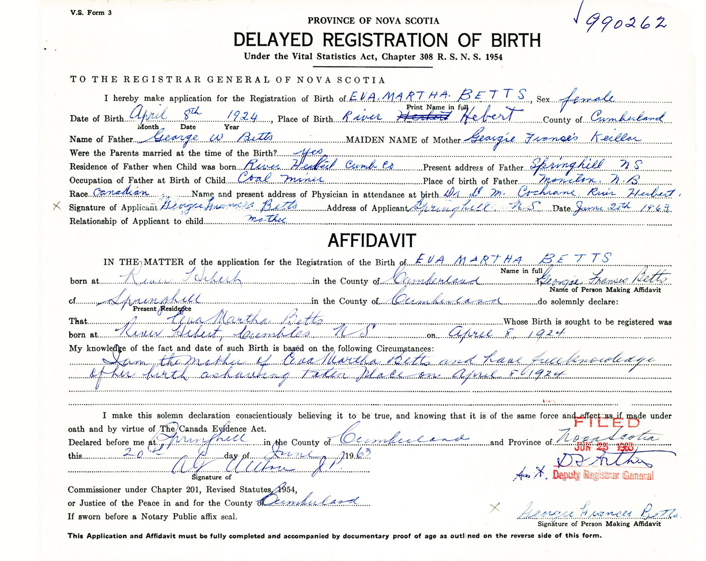 Signature of Applicant Georgie Frances Betts Address of Applicant Springhill, Cumberland Co., NS Date 20 June 1963