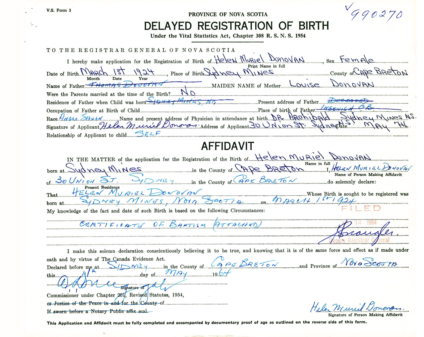 Signature of Applicant Helen Muriel Donovan Address of Applicant 30 Union Street, Sydney, Cape Breton Co., NS Date 7 May 1964