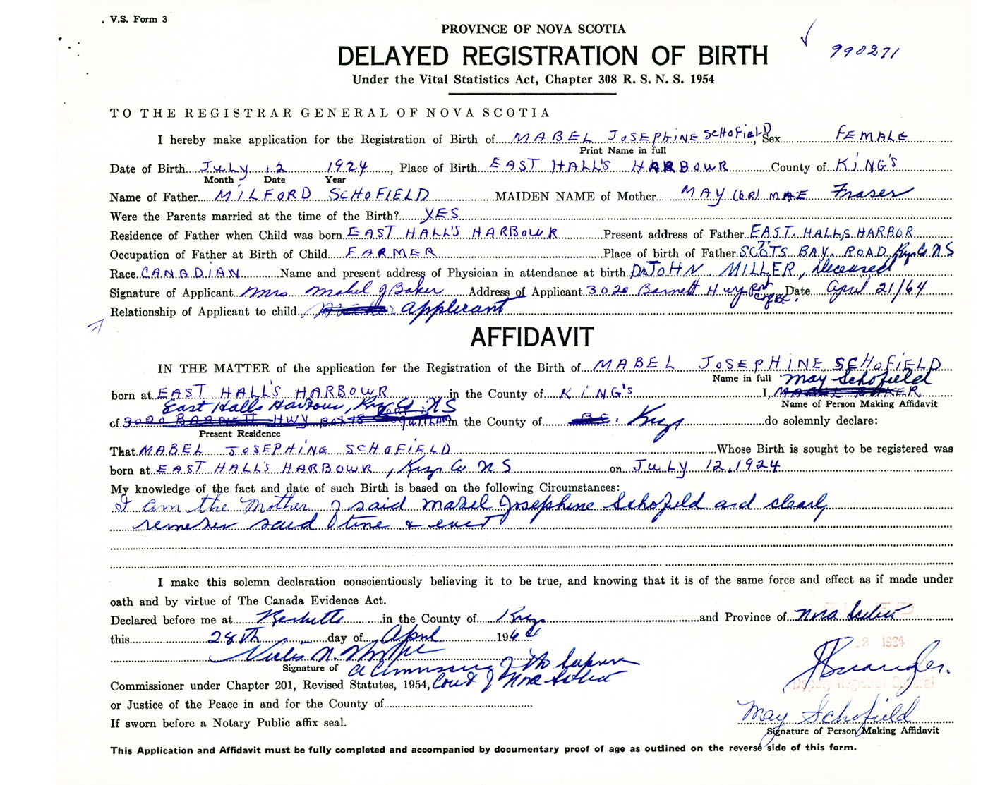 Name of Father Milford Schofield MAIDEN NAME of Mother May (or Mae) Fraser